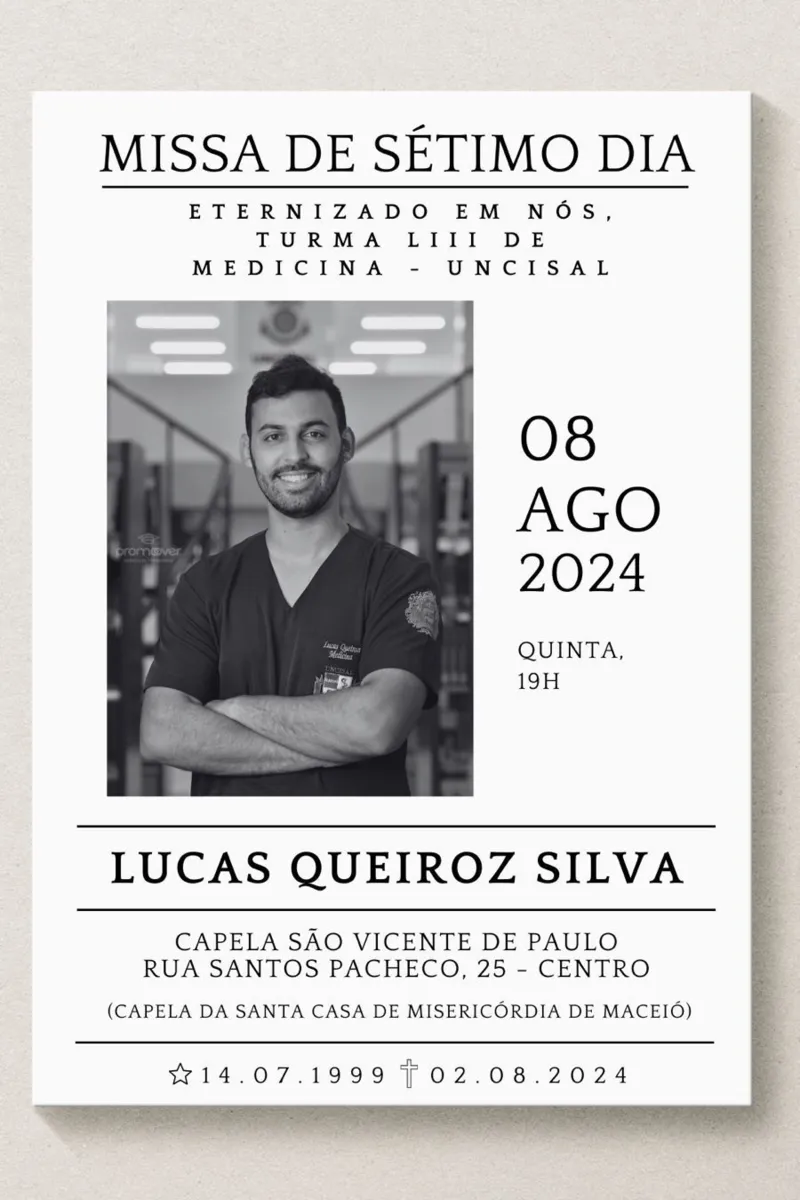 Agora, amigos organizaram uma missa de 7º dia para homenagear a vítima, que será realizada no dia 8, às 19h, na Capela São Vicente de Paulo, na Santa Casa de Maceió, no bairro do Centro. No mesmo dia, às 12h, também está marcada uma missa na Uncisal.
