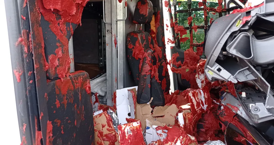 O veículo transportava uma carga de extrato de tomate, produto que ficou espalhado dentro da van, assustando quem passava pelo local, que acabou confundindo o material com sangue.