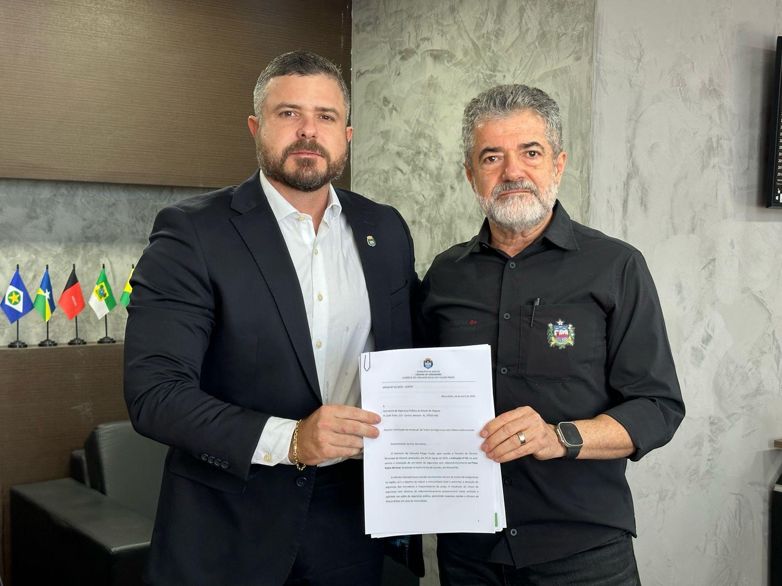 O vereador Delegado Thiago Prado se reuniu, nesta segunda-feira (14), com o secretário de Estado da Segurança Pública, Flávio Saraiva, para apresentar oficialmente a Comissão de Segurança Pública da Câmara Municipal, parabenizar a ampliação do sistema de videomonitoramento em Maceió e solicitar a instalação de totens de segurança no bairro da Gruta de Lourdes.